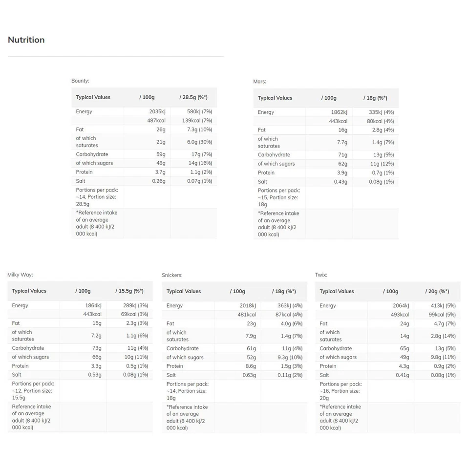 TWIX: Sugar, Glucose Syrup, WHEAT Flour, Palm Fat, Skimmed MILK Powder, Cocoa Butter, Cocoa Mass, WHEY Permeate (MILK), MILK Fat, Fat-Reduced Cocoa Powder, Salt, Emulsifier (SOYA Lecithin), Raising Agent (E500), Flavouring. MILKYWAY: Sugar, Glucose Syrup, Skimmed MILK Powder, Cocoa Butter, Cocoa Mass, Sunflower Oil, Whey Permeate (MILK), MILK Fat, BARLEY Malt Extract, Palm Fat, Salt, EGG White Powder, Emulsifier (SOYA Lecithin). SNICKERS: Sugar, Glucose Syrup, PEANUTS, Skimmed MILK Powder, Cocoa Butter, Cocoa Mass, Whey Permeate (MILK), Sunflower Oil, MILK Fat, Palm Fat, Salt, Emulsifier (SOYA Lecithin), EGG WHITE Powder. BOUNTY: Sugar, Desiccated Coconut, Glucose Syrup, Cocoa Butter, Cocoa Mass, Skimmed MILK Powder, Whey Permeate (MILK), Emulsifiers (SOYA Lecithin, E471), MILK Fat, Humectant (Glycerol), Palm Fat, Salt. MARS: sugar, glucose syrup, skimmed MILK powder, cocoa butter, cocoa mass, sunflower oil, WHEY PERMEATE (MILK), palm fat, MILK fat, fat-reduced cocoa powder, BARLEY MALT extract, salt, emulsifier (SOYA lecithin), EGG WHITE powder.